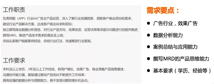 如图,第一个需求点,广告行业,效果广告。这时候你要仔细想自己过往工作经验中有没有和这两个关键词相关的经历,如果你在甲方,你是否投过腾讯广告?是否做过效果广告?如果有,很好,我们先列出来,把故事放在这个点上,之后再想怎么串起来说。