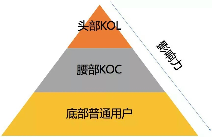 基于粉丝量的不同,KOL和KOC所能产生的影响力大小也是不一样的。如果把KOL、KOC、普通用户看作一个金字塔,那么知名度高,影响力强的KOL一定是位于塔尖,而影响力相对较弱的KOC则位于金字塔的中腰部。
