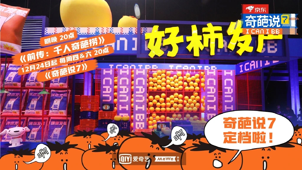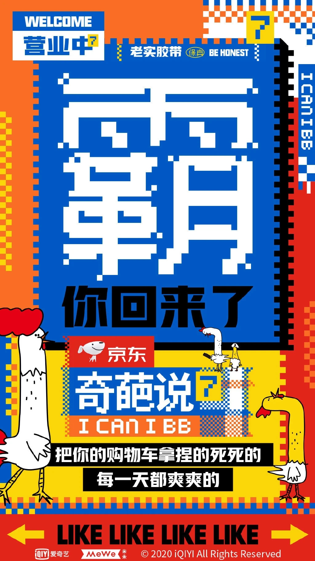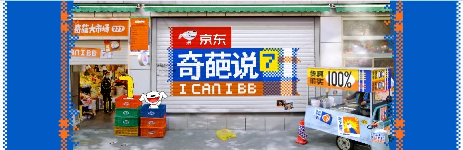 画面以蓝橙为主色调,细节上用小方块拼接,加入了胶带矩形元素,“奇葩说”logo字体,也融入了方块颗粒感,整体看起来有点像素风,又有点蓝橙编织袋的感觉。