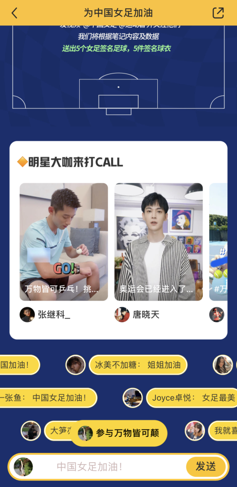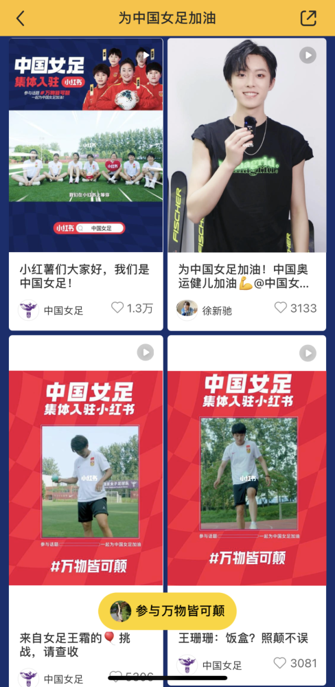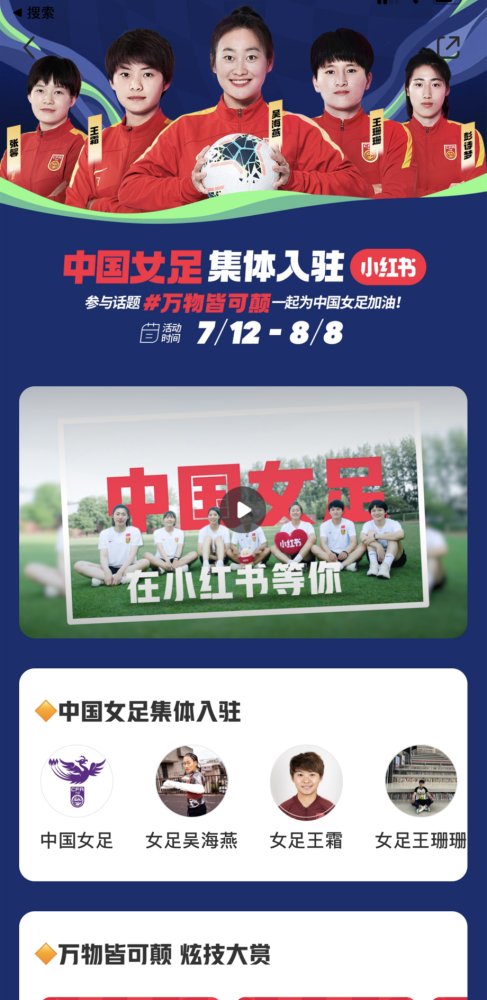 为了全方位助力女足,小红书在奥运期间发起“万物皆可颠”挑战活动,激发站内用户参与热情,邀请其他明星大咖打call,持续延展活动热度。