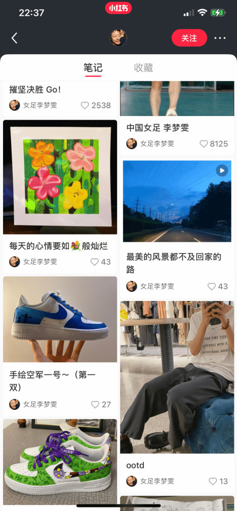 李梦雯也一样,喜欢定格生活中的美好时刻,一双手绘的新球鞋,夜晚回家路上的迷人景色,还有女生们都爱的ootd。而且有点惊喜的是,李梦雯在足球之余还一直自学画画,就像小红书上的很多用户一样,在专业领域之外探索新天地,收获新成长。