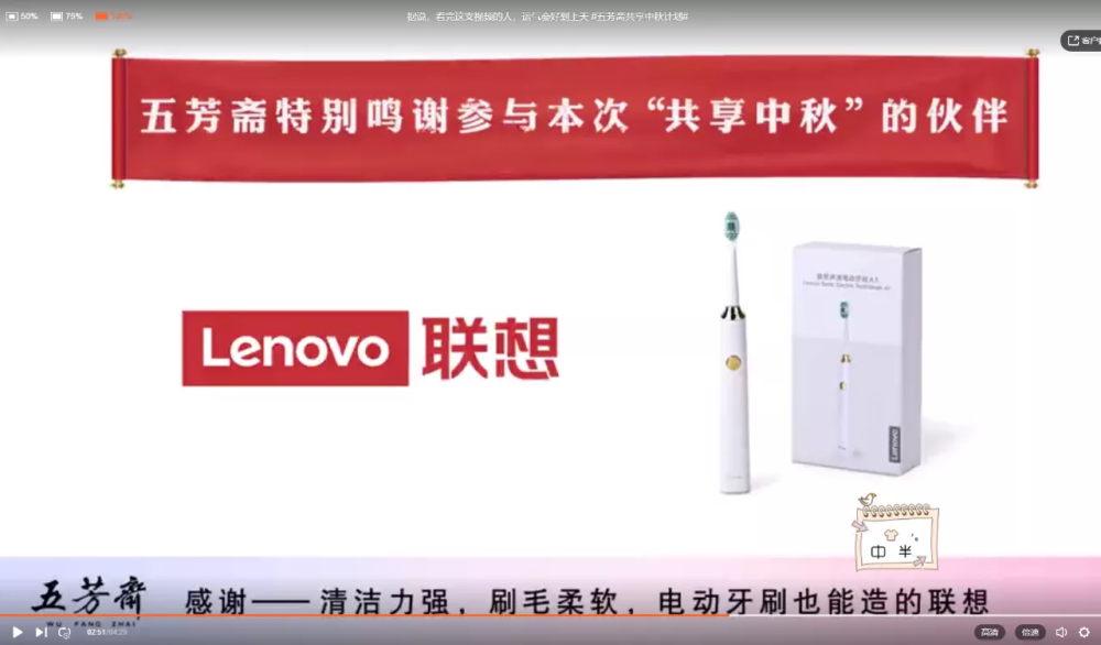 它将刺柠吉、得力、东风日产、东阿阿胶、咚漫、梵誓、海信洗衣机、环形时间、联想、柳全食品、泸州老窖、麦当劳、蒙牛、美即、慕思今晚、南方黑芝麻、特步、途牛、洽洽、千库编辑、前程无忧、认养一头牛、王小卤、网易严选、旺仔旺铺、Yeelight(按拼音首字母排序)等26家合作品牌的名字和文案一一念出。