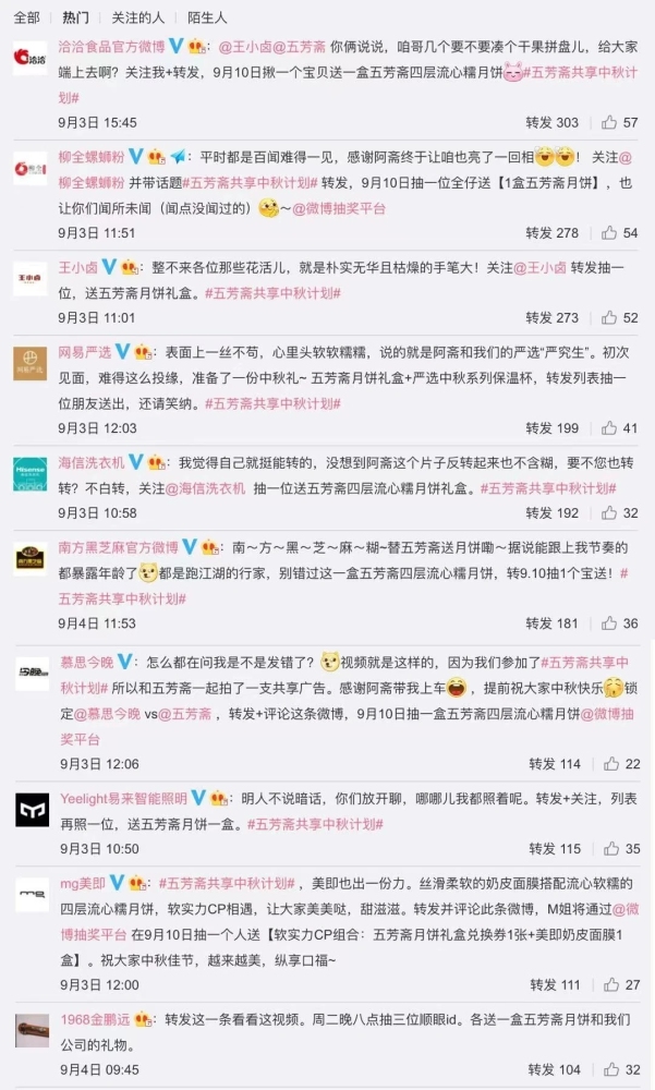 比如其官微在微博开启“五芳斋共享中秋计划”,开启微博抽奖,26个合作品牌纷纷转发加码,提供总价值千元的锦鲤大礼包。