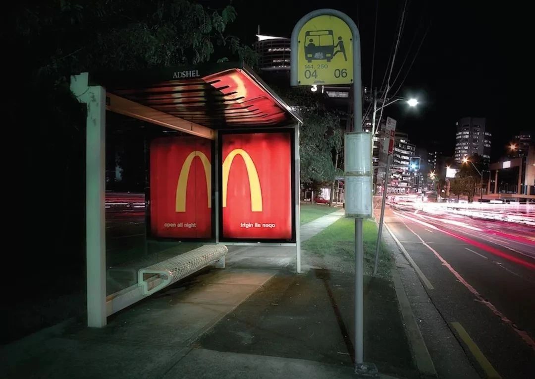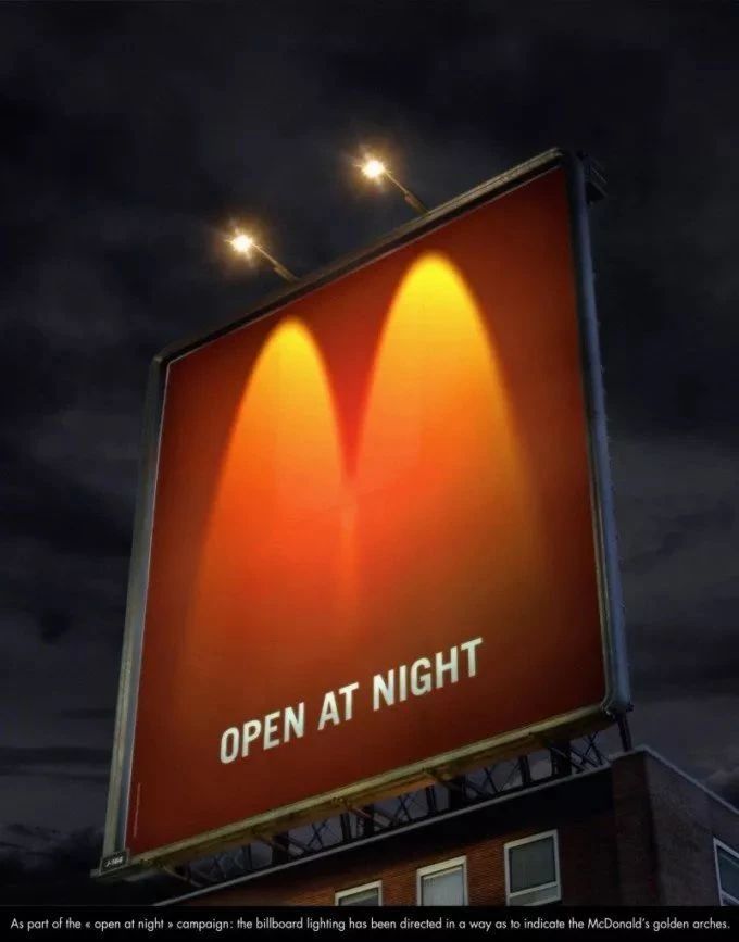 白天的站牌灯,只能看到一半的logo,平平无奇;但是一到晚上,当站牌灯光亮起后,就会形成一个对称的金拱门形状,以此来告诉晚归的路人:麦当劳半夜为你服务。可以说,这个站牌灯占尽了“天时、地利和人和”。