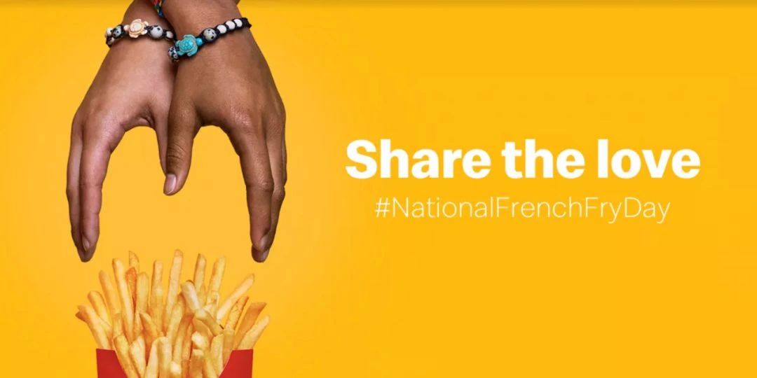 为了庆祝7月13日的“全国薯条日”,麦当劳推出了一个以分享为主题的活动,鼓励大家“分享爱”。在海报中,两个不同肤色的手在薯条上方交叠在一起,共同组成了麦当劳经典的“金拱门”形象,由此,与人分享的含义不言而喻。