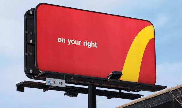 作为一家快餐品牌,为了吸引更多客流量,麦当劳经常进行户外广告来营销推广。因此,在与各种“路牌”的合作中,麦当劳对自己logo进行了各式创新的解读,诞生出了许多经典的路牌广告案例: