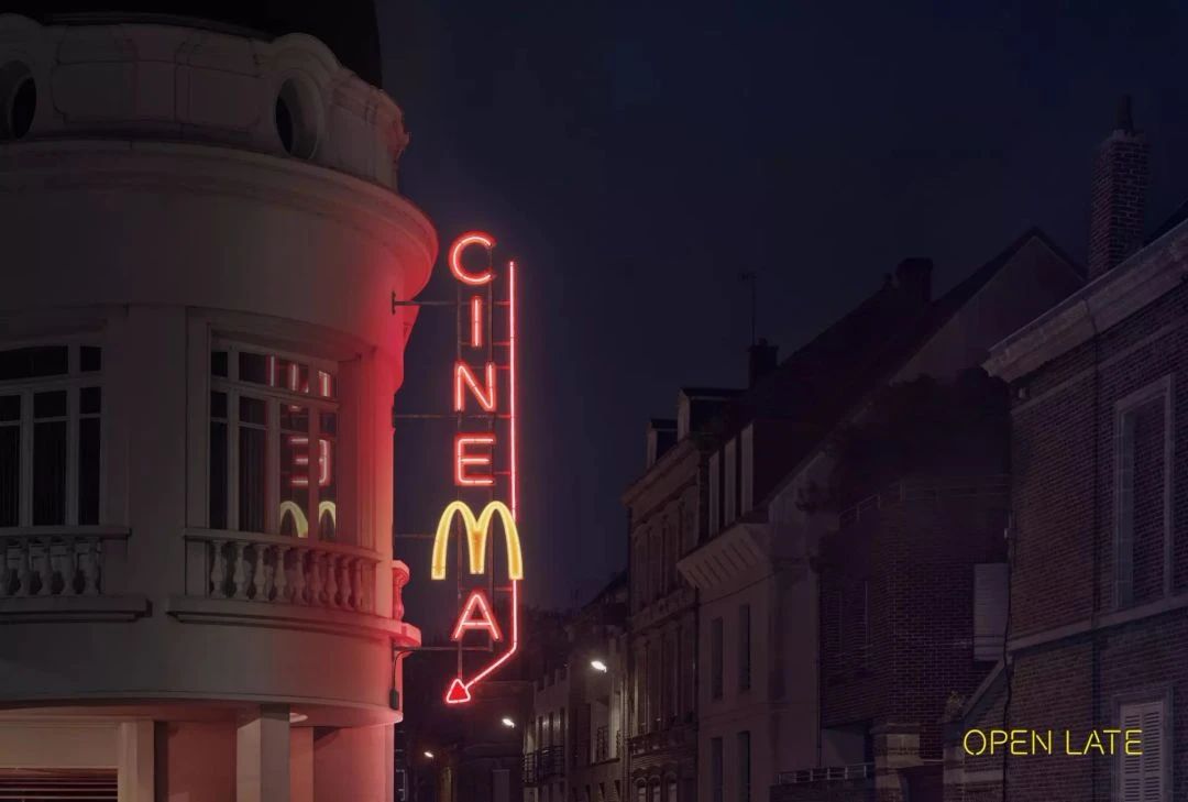 在这组海报中,麦当劳巧妙地把电影院、保龄球馆、游戏厅等招牌里的“M”字母换成了自己的金色logo。配合画面中这些店门关闭和“open late(迟开)”文案的信息,麦当劳向大家传递:虽然这些店铺在半夜没有营业,但是无论何时,无论何处,麦当劳都会为您服务。