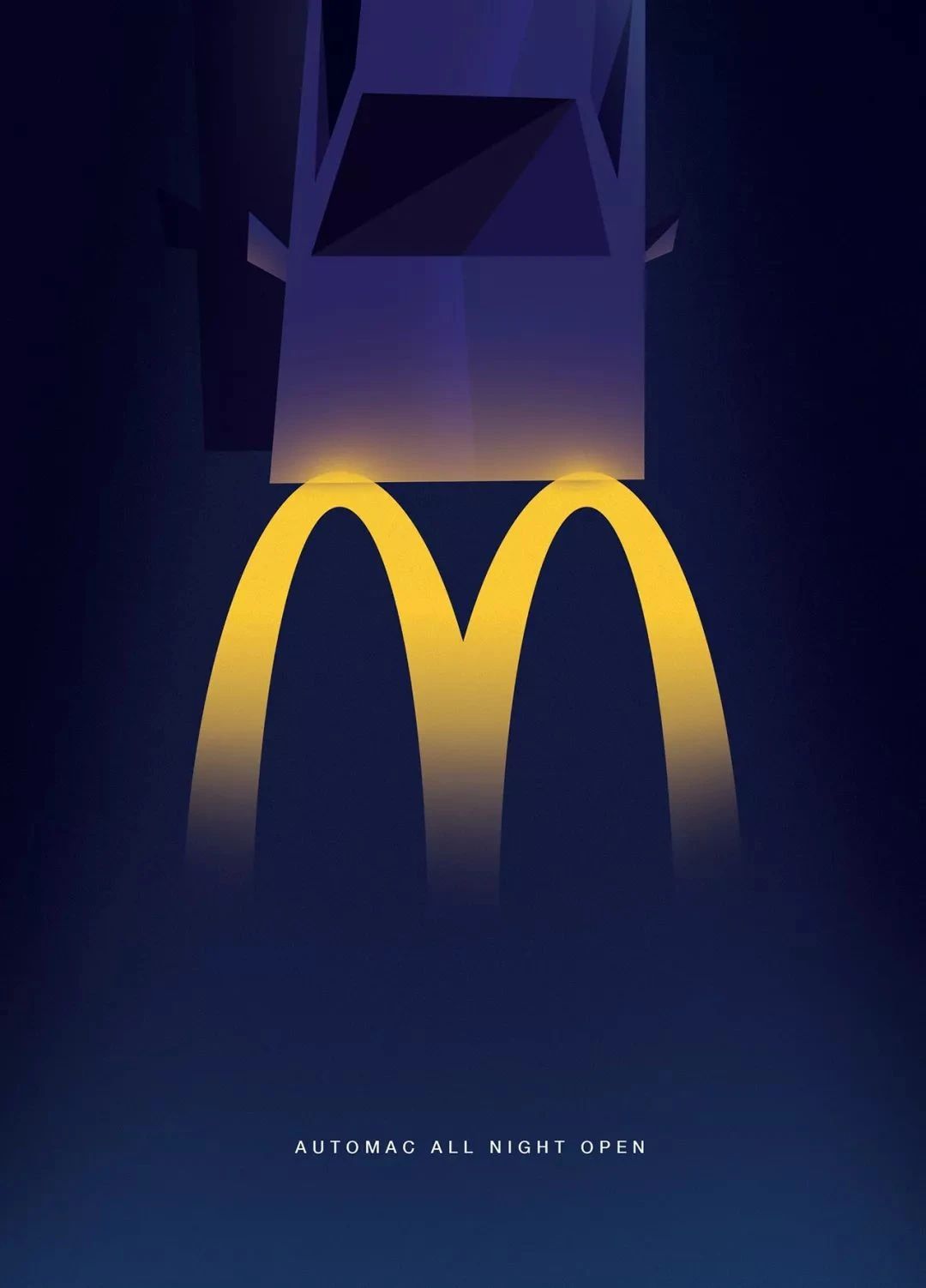 除了与各种站牌结合以外,麦当劳在阐释会“通宵营业”时,还喜欢运用夜晚中常见的元素来辅助设计,当它把logo与深夜的物品进行巧妙的结合时,竟然一点也不违和: