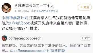 视频的点睛之笔还在于开头有一段让人“恐惧”的配音,那就是高度模仿《第八套人民广播体操》配音,只是改成了“现在开始做在家辅导不要生气赞美操”。“难道这是一个魔改广播体操的健身操?”